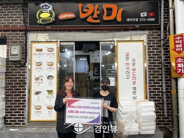 (경인뷰) 오산종합사회복지관은 지난 23일 오색시장에 소재한 베트남 샌드위치 전문점 ‘반미’가 지역 독거어르신의 든든한 한 끼및 영양 섭취를 위해 매월 30만원 상당 연유와 백미빵 100개를 정기 후원한다고 밝혔다.