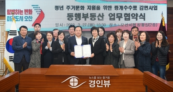(경인뷰) 오산시와 한국공인중개사협회 오산시지회는 27일 시청 상황실에서 청년주거문화 지원을 위한 중개수수료 감면사업인 ‘동행부동산’업무협약을 체결했다.