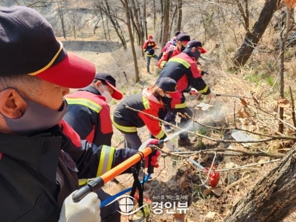 이날 훈련에는 공원녹지과 직원과 산불 예방 인력 등 31명과 산불지휘차량 1대, 산불진화차량 2대, 등짐펌프 30여 개 등이 투입됐다.