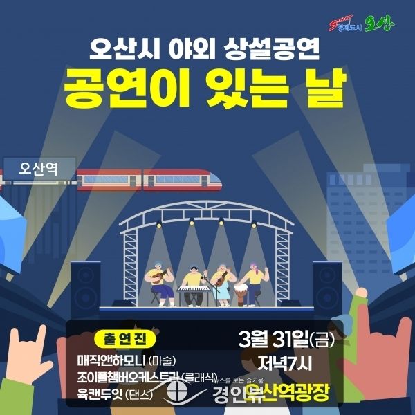 (경인뷰) 오산시는 3월 31일 저녁 7시 오산역, 4월 1일 오후 4시 고인돌공원에서 연이어 ‘공연이 있는 날’을 개최한다고 밝혔다.
