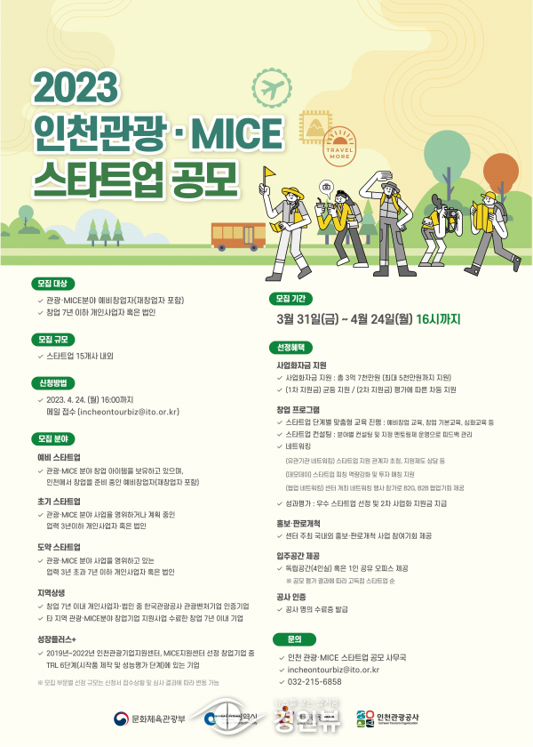 김충진 시 문화체육관광국장은 “팬데믹 이후 침체된 관광·MICE산업이 활력을 찾고 있는 시기인 만큼 이번 신규 관광·MICE 스타트업 공모를 통해 인천 관광·MICE산업 활성화를 주도할 능력 있는 스타트업이 발굴되기를 기대한다”고 밝혔다.