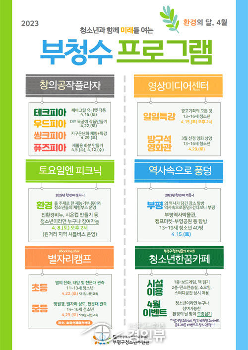 (경인뷰) 부평구 청소년수련관이 4월 ‘환경의 달’을 맞아 다양한 특강과 체험활동을 운영한다.