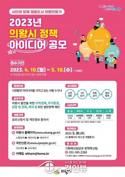 (경인뷰) 의왕시는 시민들의 다양하고 참신한 아이디어를 정책에 반영하기 위해 오는 4월 10일부터 5월 10일까지 31일간 `2023년 의왕시 정책 아이디어 공모’를 실시한다고 3일 밝혔다.