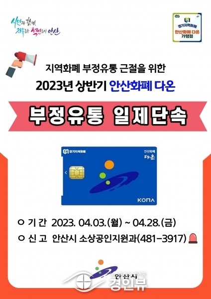 (경인뷰) 안산시는 이달 28일까지 안산 지역화폐 ‘다온’의 부정유통을 방지하기 위한 일제 단속을 실시한다고 4일 밝혔다.