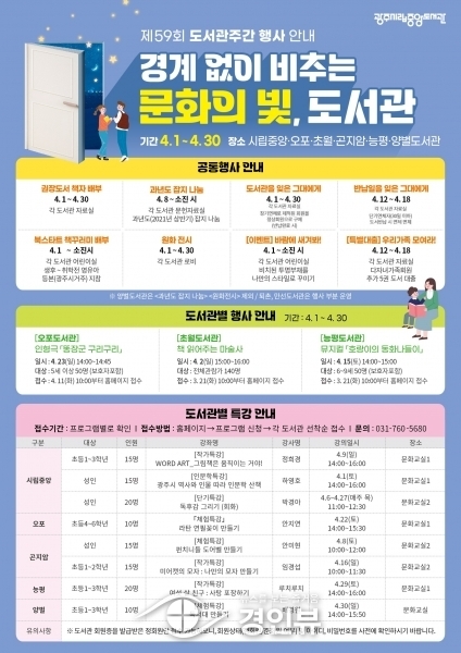 (경인뷰) 광주시립중앙도서관은 4월 ‘제59회 도서관 주간 및 4월 12일 도서관의 날’을 맞아 ‘경계 없이 비추는 문화의 빛, 도서관’을 주제로 다양한 독서문화행사를 펼칠 예정이다.
