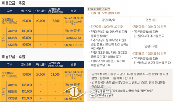 오토캠핑장을 이용하는 서구주민과 장애인, 국가유공자, 기초생활수급자 등은 30% 감면된 요금으로 이용할 수 있다.