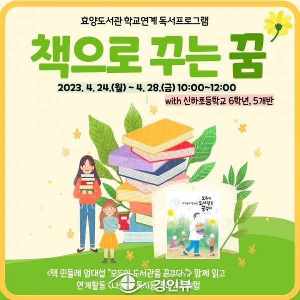 (경인뷰) 이천시 효양도서관은 오는 24일부터 28일까지 신하초등학교 6학년 5개반과 연계해 도서관 견학프로그램 “책으로 꾸는 꿈”을 운영한다.
