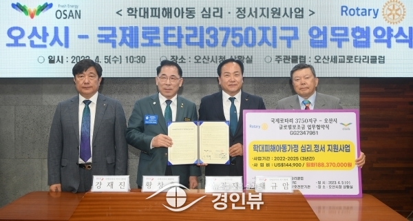 (경인뷰) 오산시가 국제로타리3750지구와 지난 5일 시청 상황실에서 학대 피해 아동과 가족의 회복을 도모하고 심리·정서 지원사업 추진을 위한 업무협약을 맺었다.