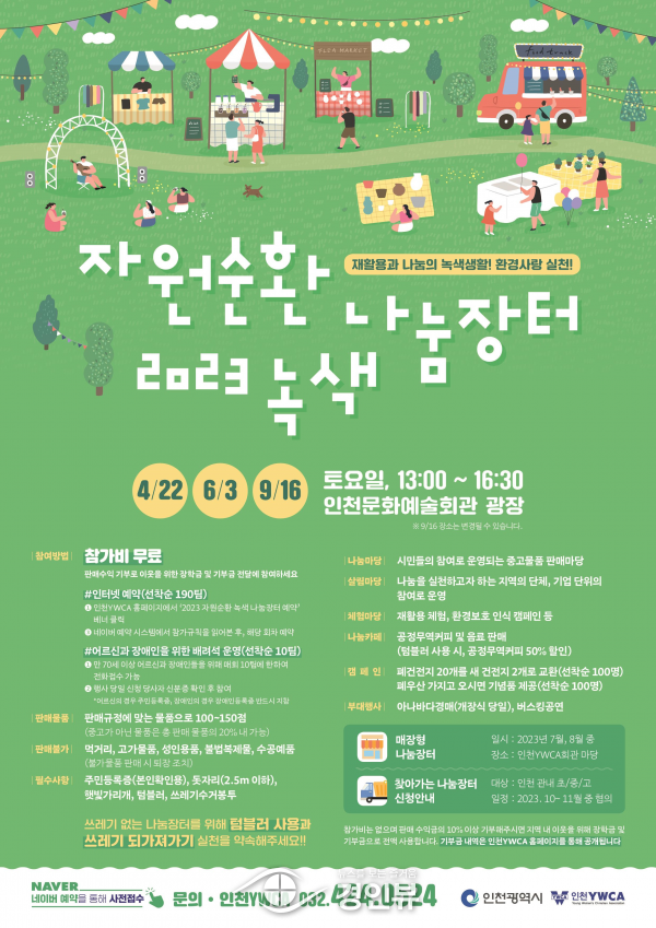 나눔장터에 판매자 참가를 원하는 시민은 4월10일부터 21일까지 인천YWCA 누리집 ‘나눔장터 예약 신청’ 배너를 통해 예약할 수 있다.