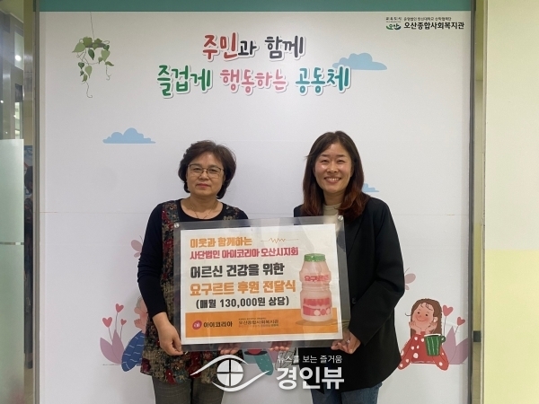 (경인뷰) 오산종합사회복지관은 지난 4일 아이코리아 오산시지회가 지역사회 독거 어르신 건강과 영양 섭취에 써달라며 매월 13만원 상당의 요구르트를 정기적으로 기탁한다고 밝혔다.