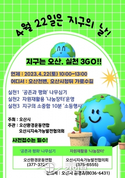 (경인뷰) 오산시는 오는 22일 기후변화의 심각성과 탄소중립의 중요성을 알리고 온실가스 감축을 위한 생활 실천 참여를 유도하기 위해 ‘지구는 오산, 실천 3GO’행사를 개최한다고 밝혔다.