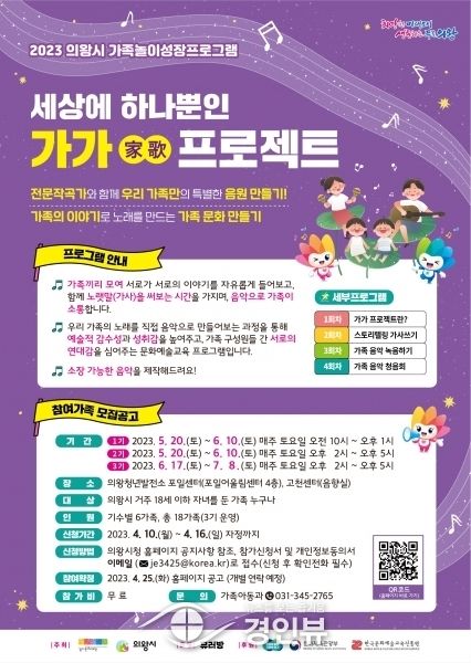 (경인뷰) 의왕시는 가족놀이성장프로그램 ‘세상에 하나뿐인 가가프로젝트’참여가족을 4월 10일부터 16일까지 모집한다고 밝혔다.