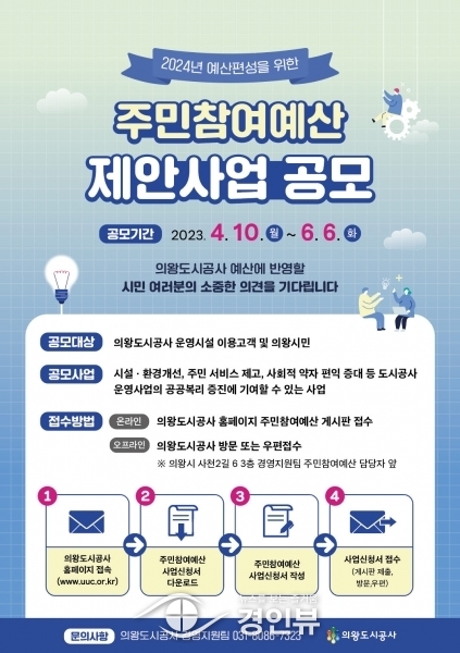 (경인뷰) 의왕도시공사는 2024년도 예산을 수립하기에 앞서 주민들의 의견을 수렴해 예산을 반영하고자 주민참여예산 제안사업 공모를 실시한다고 밝혔다.