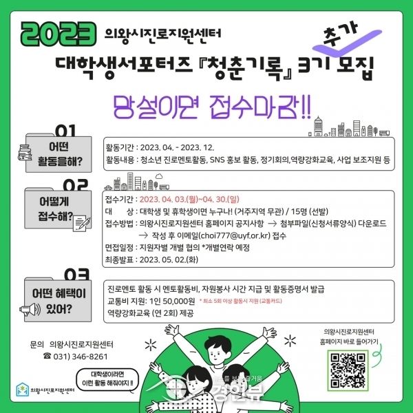 한편 의왕시진로지원센터에서는 대학생서포터즈 ‘청춘기록’3기 추가모집을 4월 말까지 진행한다.