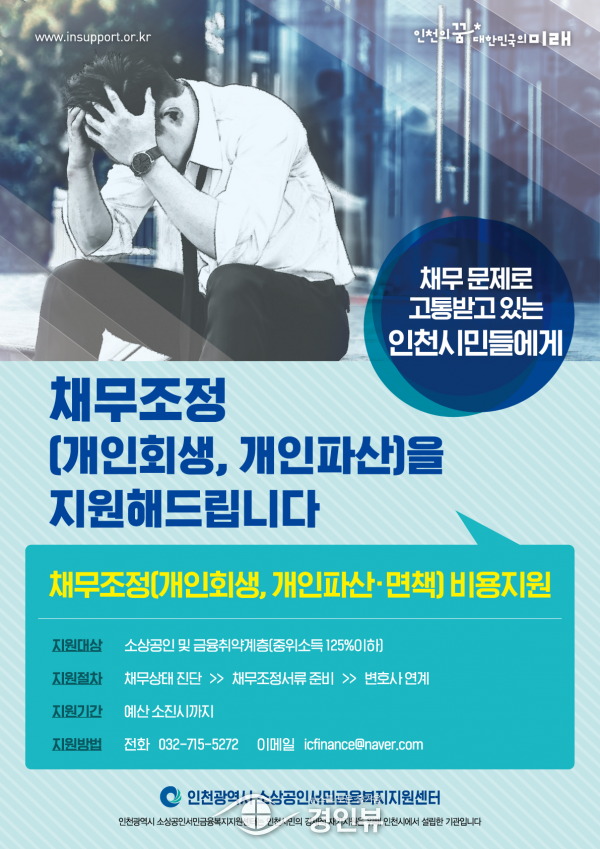 인천시는 2018년부터 어려움을 겪고 있는 소상공인 및 금융취약계층 13,353명에게 채무해결 컨설팅을 실시했으며 이 중 2,023명에게 개인파산, 개인회생, 워크아웃 등 채무조정비용을 지원했다.