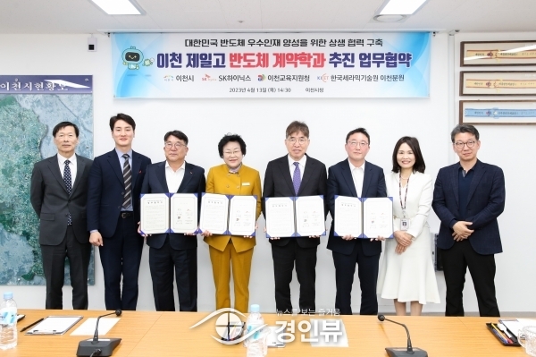 이천시는 13일 SK하이닉스, 이천교육지원청, 한국세라믹기술원과 함께 이천제일고등학교 반도체 계약학과 신설을 위한‘반도체 인재양성 업무협약’을 체결했다고 밝혔다.