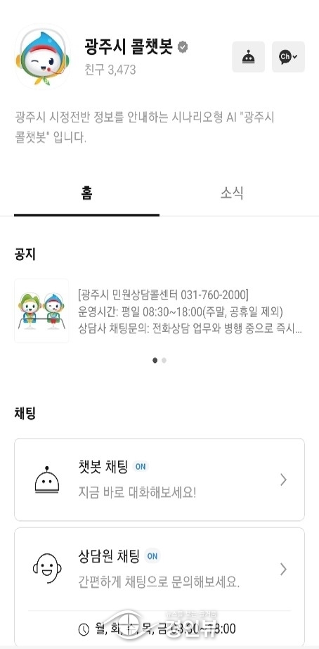 (경인뷰) 광주시는 시민에게 다양한 시정정보 접근성과 편의성 제공을 위해 “광주시 콜챗봇” 민원 상담 서비스를 개선해 17일부터 카카오톡 지능형 콜챗봇 민원 상담 서비스를 실시한다.