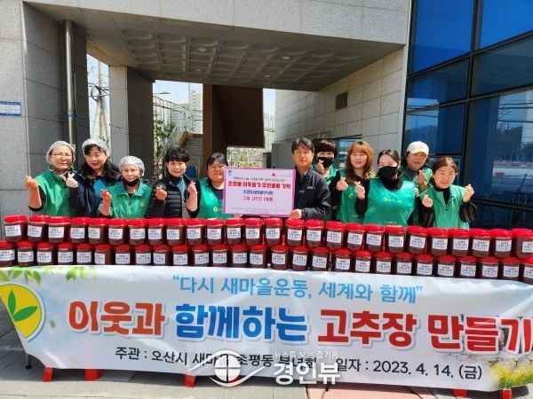 (경인뷰) 오산시 초평동 새마을부녀회가 지난 14일 초평동 행정복지센터에서 ‘이웃과 함께하는 고추장 만들기’행사를 열고 수제 고추장 총 100통을 기탁했다.