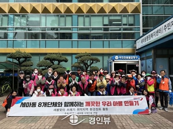 이날 환경정화 활동에 세마동 8개 단체 회원 및 동 직원 등 80여명이 2개의 팀으로 나누어 거리 곳곳에 지난 겨울 적치된 각종 쓰레기를 수거했다.
