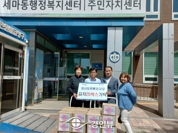 (경인뷰) 오산시 세마동은 지난 14일 양산동 원불교 교당에서 이웃돕기 김치 25박스를 기탁했다고 밝혔다.