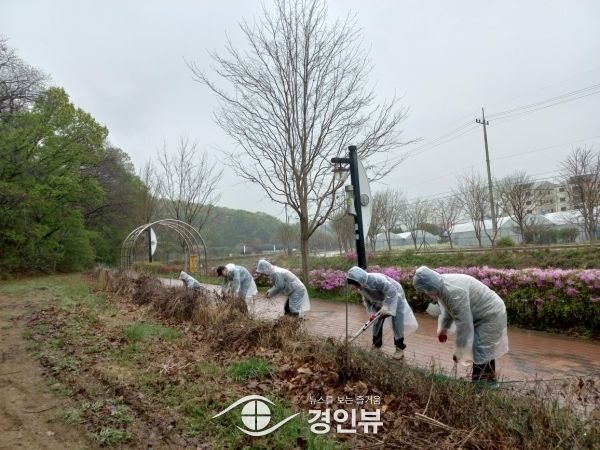 이날 주민자치위원들은 비 오는 궂은 날씨에도 불구하고 왕곡천 산책로의 겨우내 묵은 잡초를 제거하고 왕림마을 입구의 유휴지에 수국을 심으며 구슬땀을 흘렸다.