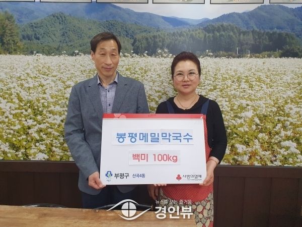 (경인뷰) 부평구 산곡4동은 최근 관내에 소재하는 봉평메밀막국수 대표로부터 백미 100㎏을 전달받았다.