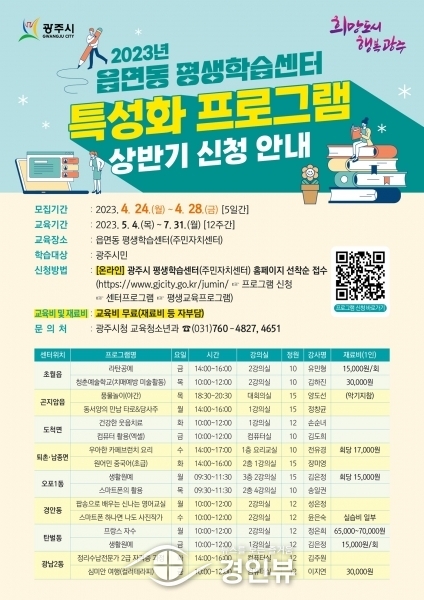 (경인뷰) 광주시는 24일부터 28일까지 5일간 2023년 상반기 읍면동 평생학습센터 특성화 프로그램 학습자를 모집한다고 밝혔다.