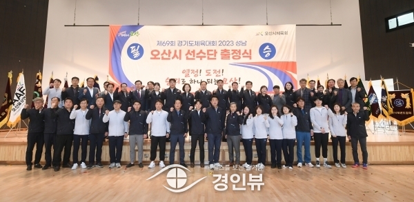 (경인뷰) 오산시는 지난 24일 오산오색문화체육센터에서 ‘제69회 경기도체육대회 2023 성남’ 오산시선수단 출정식을 갖고 필승 결의를 다졌다.
