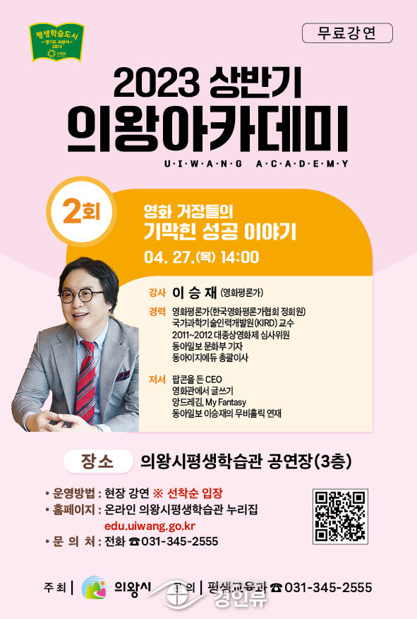 이번 강연은 의왕시평생학습관에서 선착순 무료입장으로 진행되며 관심 있는 의왕시민이라면 누구나 참여할 수 있다.