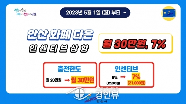 (경인뷰) 안산시는 위축된 소비심리를 진작시키고 지역경제 활성화에 기여하기 위해 5월부터 안산화폐 ‘다온’의 충전 한도를 월 20만원에서 30만원으로 확대하고 인센티브도 기존 6%에서 7%로 확대한다고 28일 밝혔다.