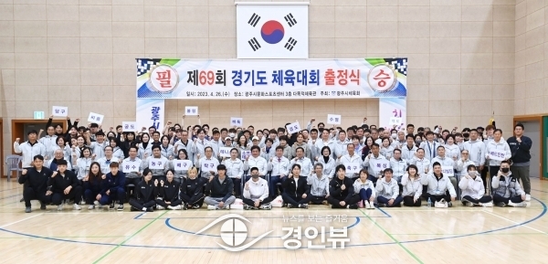 (경인뷰) 광주시는 제69회 경기도체육대회 ‘2023 성남’에 출전하는 광주시 선수단의 필승 결의를 다짐하는 출정식을 지난 26일 광주시문화스포츠센터에서 개최했다.