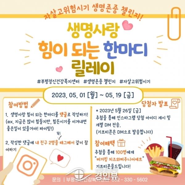 참여방법은 부평정신건강복지센터 인스타그램 계정 게시글에 생명사랑 힘이 되는 한마디를 댓글로 작성하고 작성한 댓글에 친구 2명을 태그하면 된다.