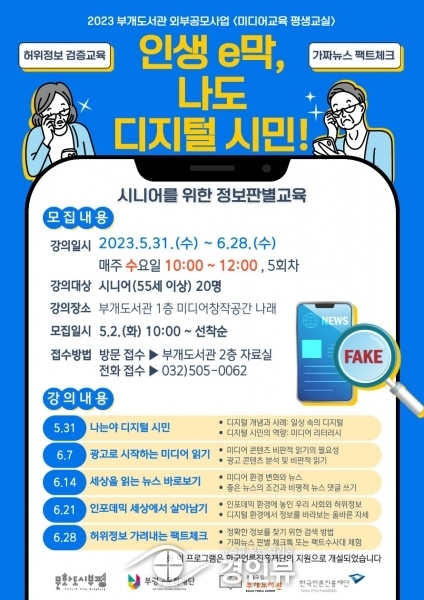 배창섭 부평구문화재단 도서관본부장은 “스마트폰 사용으로 장시간 미디어에 노출된 시니어 세대가 팩트체크를 통해 가짜뉴스에 휩쓸리지 않는 비판적 사고를 키울 수 있길 바란다”고 말했다.