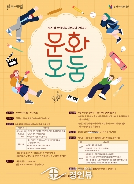 (경인뷰) 부평구문화재단이 오는 21일까지 청소년 문화예술 동아리 대상의 지원사업 ‘문화모둠’ 공모를 진행한다.