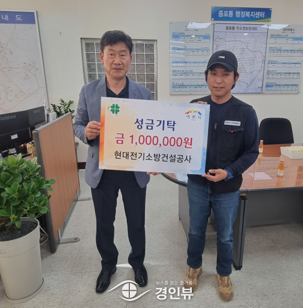 (경인뷰) 이천시 창정동 소재 현대전기소방건설공사가 5월 3일에 증포동행정복지센터에 이웃돕기 성금 일백만원을 기탁했다.