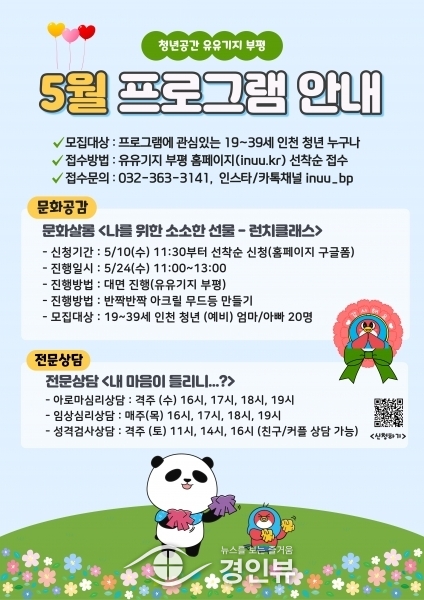 유유기지 부평 관계자는 “5월 가정의 달을 맞아 청년임을 잊고 살던 청년 부모들에게도 일상생활 속 재미와 힐링을 느낄 수 있는 프로그램을 기획했으니 많은 관심과 참여 부탁드린다”고 말했다.
