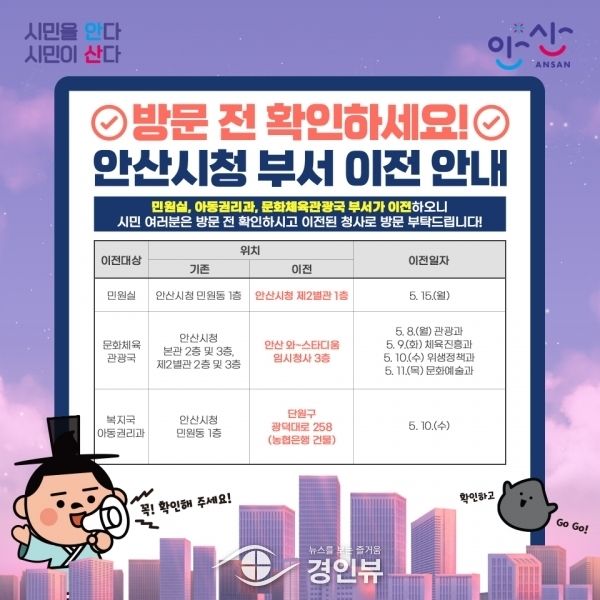 현재 민원동 1층에 위치한 민원실은 오는 15일부터 청사 내 제2별관 1층으로 이전해 업무를 개시하며 문화체육관광국은 안산 와~스타디움 임시청사 3층으로 아동권리과는 단원구 광덕대로 258에 소재한 농협 건물로 이전한다.