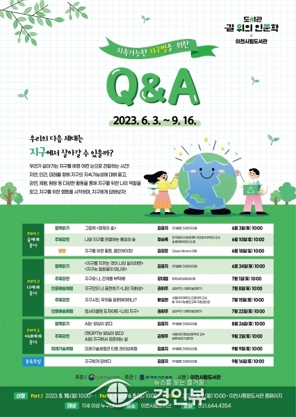 (경인뷰) 이천시 시립도서관은 문화체육관광부가 주최하고 한국도서관협회가 주관한 2023년 도서관 길 위의 인문학 공모 사업에 선정되어 ‘지속가능한 지구별을 위한 Q&A’를 주제로 인문학 프로그램을 진행한다.