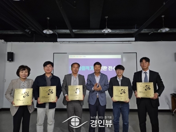 안산시사회적경제지원센터에서 진행된 수여식은 문화예술사회적협동조합컬처75 사단법인 가치있는누림 코리아클린체인지서비스 도시숲센터사회적협동조합 디에스클린 등 5개 사회적 기업체 대표 및 관계자가 참석했다.