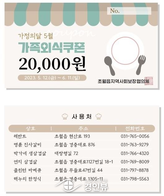 (경인뷰) 광주시 초월읍지역사회보장협의체는 가정의 달을 맞아 ‘우리가족 외식하자 GO’사업을 실시한다고 밝혔다.