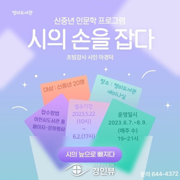(경인뷰) 이천시청미도서관에서는 6월 7일부터 8월 9일까지 중년 인문학프로그램‘시의 손을 잡다’을 운영한고 밝혔다.