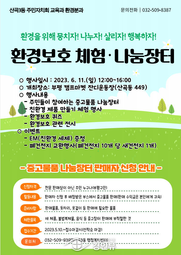 (경인뷰) 부평구 산곡3동 주민자치회가 17일 환경보호 체험·나눔장터 참여자를 선착순으로 모집한다.