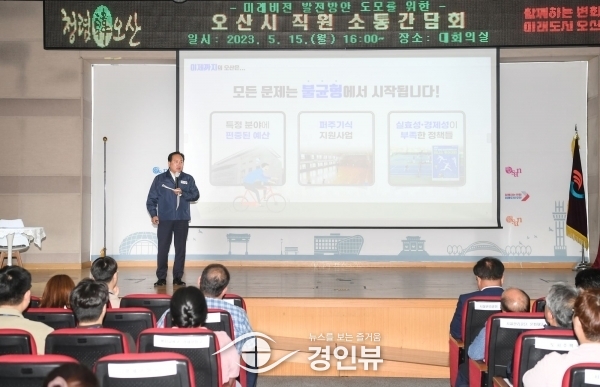 (경인뷰) 이권재 오산시장이 5월 15일부터 5월 17일까지 3회에 걸쳐 시청 대회의실에서 8급부터 9급 공직자 등 550여명 대상으로 시정발전 소통 간담회를 가졌다.