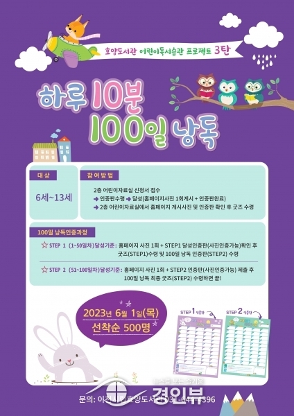 (경인뷰) 이천시 효양도서관은 어릴 때부터 책 읽는 즐거움을 느끼며 자발적인 독서습관 고취를 위한 어린이독서습관 프로젝트 3탄 ‘하루 10분 100일 낭독’을 운영한다.