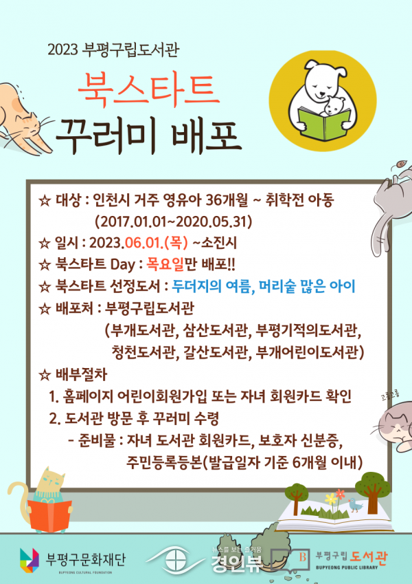 (경인뷰) 부평구 부평기적의도서관은 다음달 1일부터 인천 거주 중인 36개월부터 취학 전 영유아를 대상으로 ‘2023년 북스타트 3단계 책꾸러미’를 배포한다.