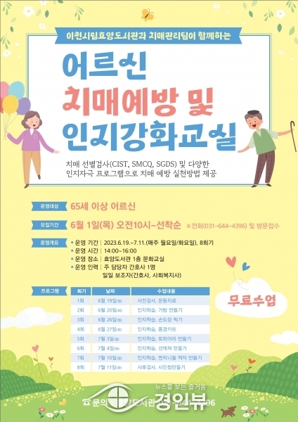 (경인뷰) 이천시립효양도서관은 6월 19일부터 7월 11일까지 매주 월요일과 화요일에 “어르신 치매예방 및 인지강화교실”을 운영한다.