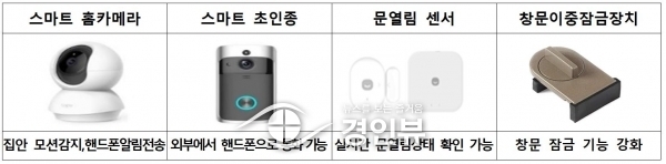안심홈세트 지원물품은 스마트 홈카메라 스마트 초인종 문열림 센서 창문이중잠금장치로 대부분 사물인터넷을 활용해 집 내·외부의 보안을 유지할 수 있는 물품으로 구성되어 있다.
