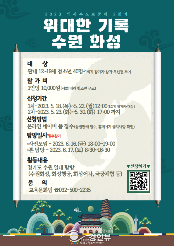 (경인뷰) 부평구 청소년수련관은 오는 30일까지 ‘역사 속으로 풍덩’ 2기에 참여할 관내 12~19세 청소년 40명을 선착순 모집한다.