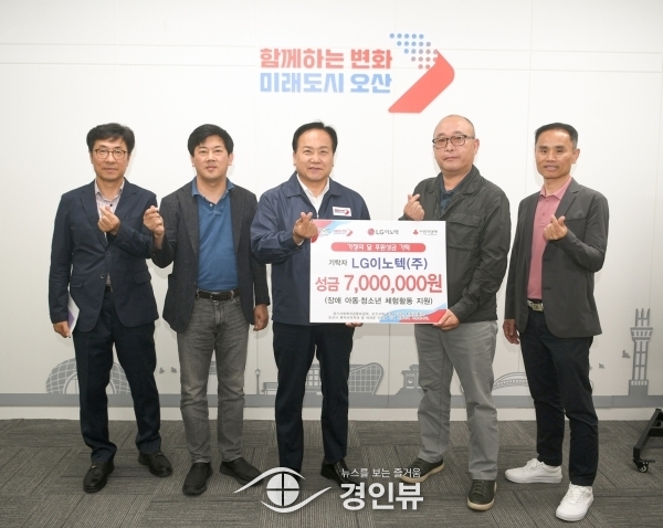 (경인뷰) LG이노텍이 지난 24일 오산시 장애 아동청소년 체험활동 지원을 위해 써달라며 시장 집무실에서 700만원을 전달했다.