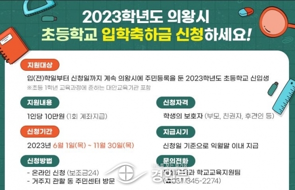 (경인뷰) 의왕시는 초등학생의 입학을 축하하고 학부모의 교육비 부담을 경감하기 위해 2023학년도 초등학교 입학생에게 입학축하금 10만원을 지급한다고 26일 밝혔다.